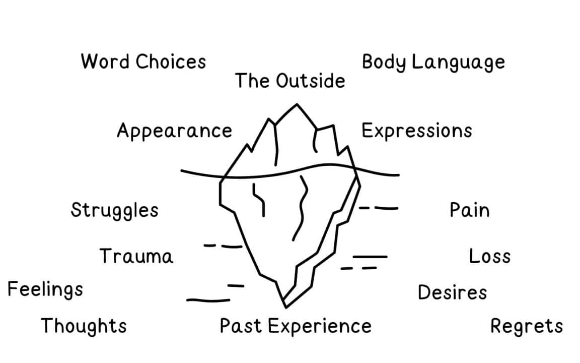 Once we realise every person we meet, is fighting a battle we know nothing about, we can put aside our judgements and treat them with empathy. The diagram above shows that when we meet a person, we see only the superficial aspects of a person without knowing their inner struggles and the issues they face.